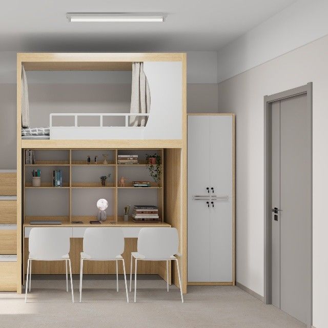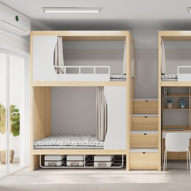 เตียงสองชั้นดีไซน์ทันสมัยสำหรับหอพักเยาวชน พร้อมคำแนะนำการประกอบที่ง่าย