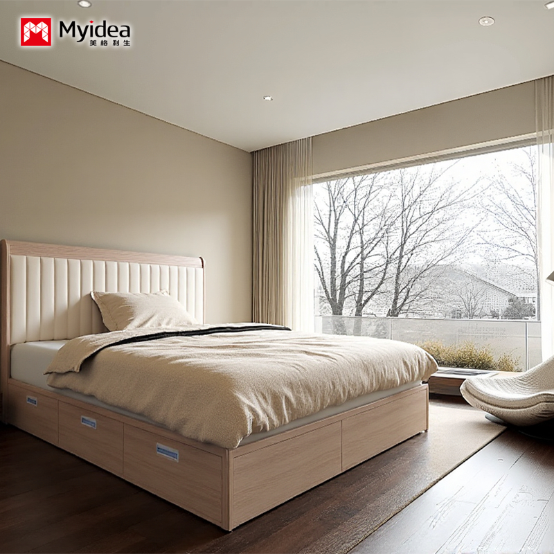 เตียงหลายประการแบบทันสมัยแบบขั้นต่ํา พร้อมตู้ชักผ้า เตียงศิลปะหนังลมครีม เตียงคู่ขนาดเล็ก 3 ชัก