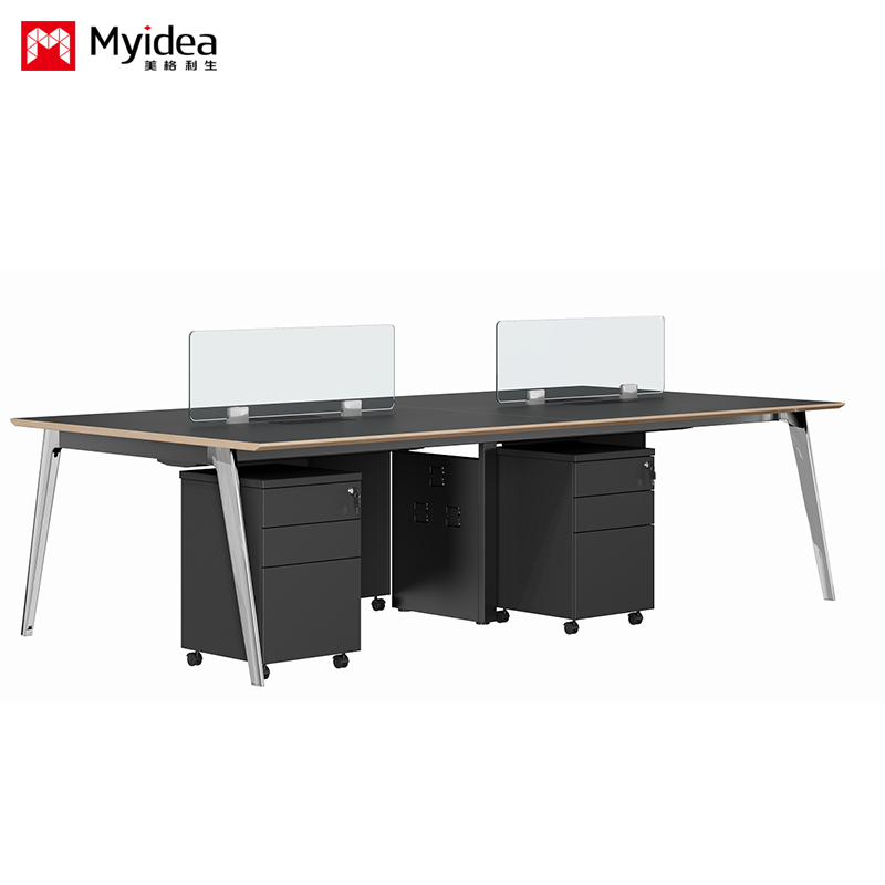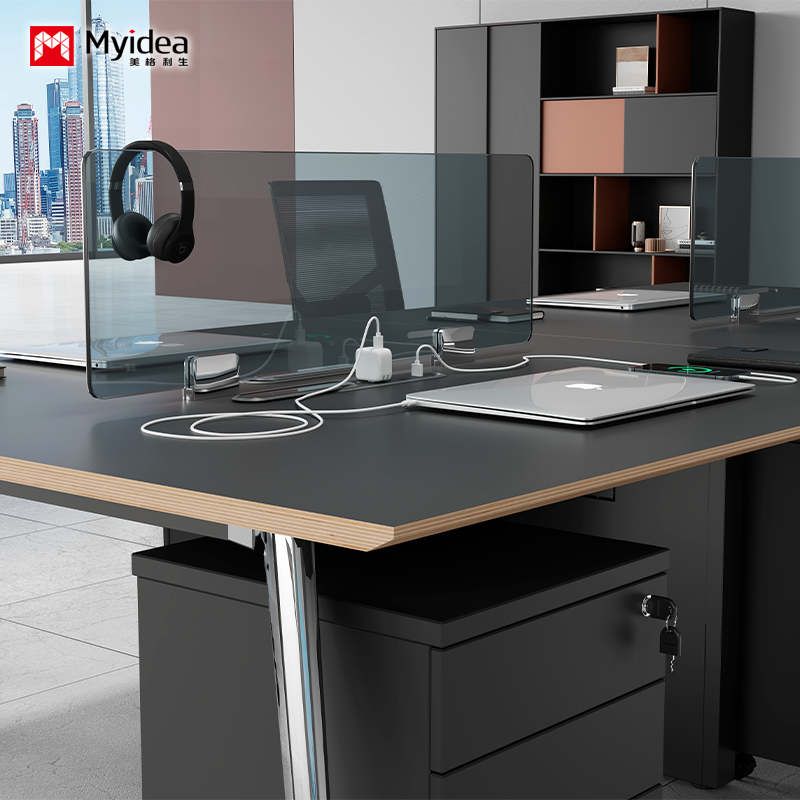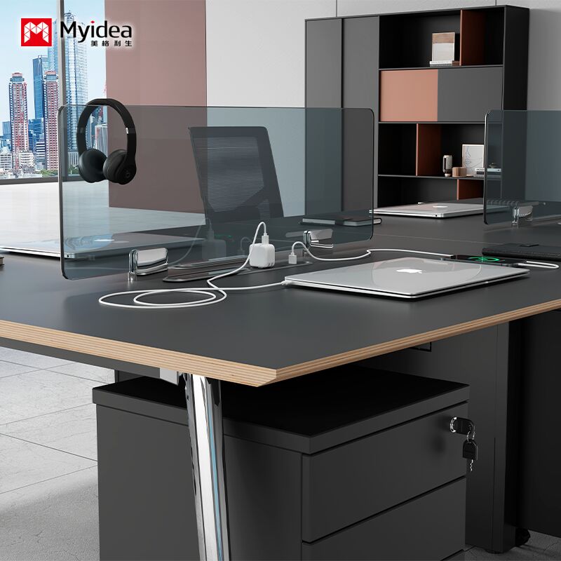 การปรับแต่ง โต๊ะทํางานของพนักงานเรียบง่ายและทันสมัย มี 4 จุดทํางานด้วยมือ โต๊ะทํางานเรียบร้อยและใช้ได้ มีหน้าจอ