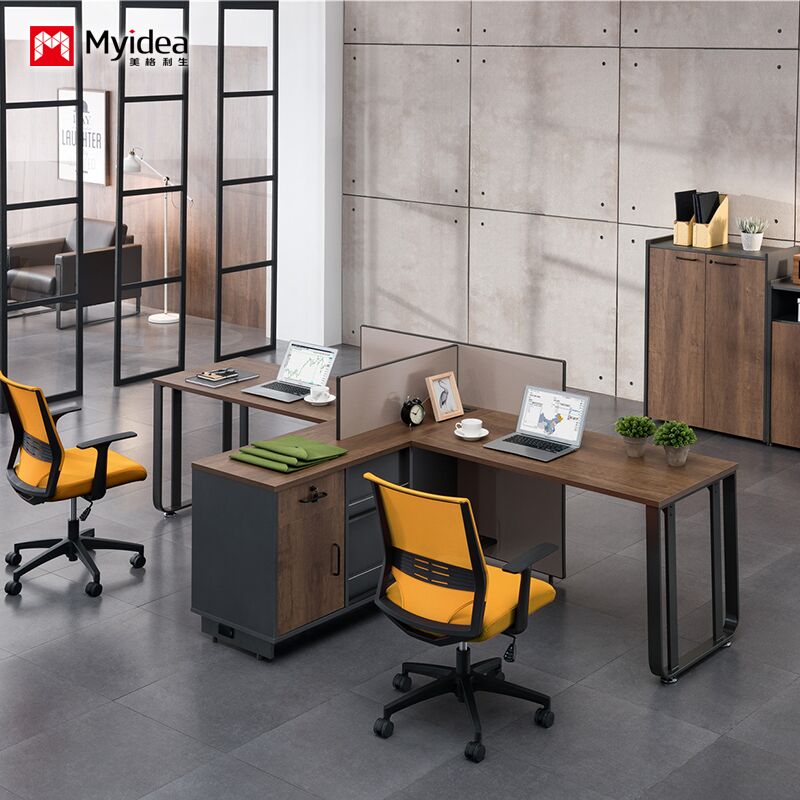 โต๊ะทำงานสำนักงานสำหรับสองคนพร้อมตู้เก็บของด้านข้างขาเหล็ก โต๊ะทำงานพนักงานทำจากวัสดุแผ่นเมลามีน